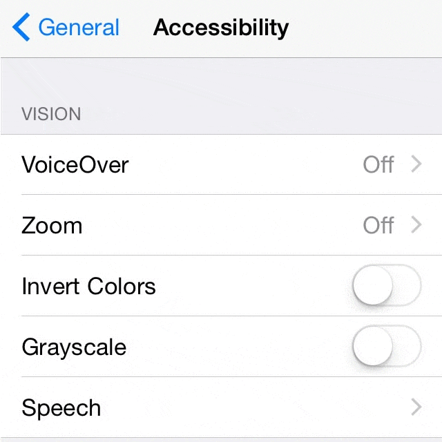 Posted in TILs by Tyrone on October 23, 2014Now, unless you’re a retro addict, you might wonder who would use Grayscale on its iOS device? A decent answer would be that it could help users with visual impairments, such as those with color blindness or color deficiency.