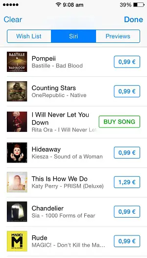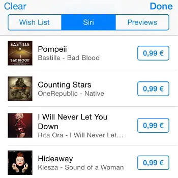 ]Tap the iTunes Store icon on your iPhone or iPad. Now, hit the top right button and the Wish List screen opens. Open the Siri tab and the list with all songs recognized by Siri are displayed in the order of interrogation. Along with the tune name, you are prompted with information about the artist and the album that contains the researched hit. You also have the option to Buy Song if you tap on the price tag. When you consider that this list isn’t helpful anymore, you can delete it by taping on Clear, available in the top left corner. This way you’ll clear the screen for a new set of recognized songs.
