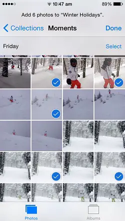 Whenever you have a new set of images and wish to add them to an already created folder, simply tap on Photos and open the Album in question. Now tap on Select in the top right corner and the ‘Add’ feature becomes available at the bottom of your screen. Press it and select the images from Camera Roll. Tap ‘Done’ when ready.