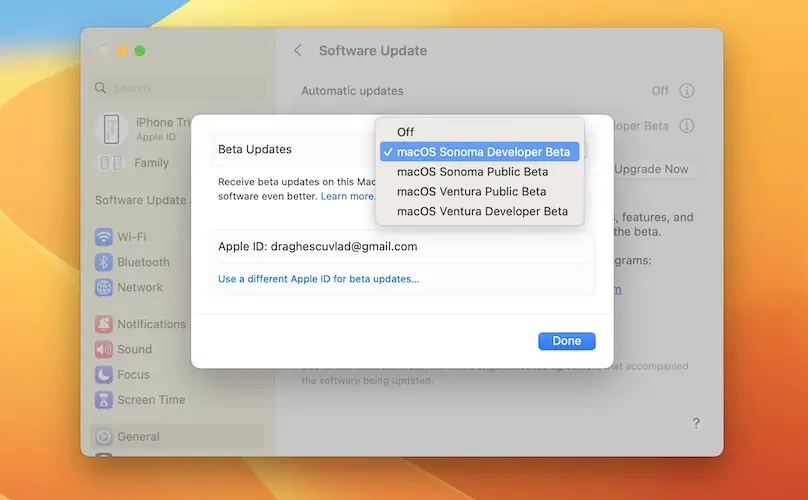 - 2. Select macOS Sonoma Developer Beta or macOS Sonoma Public Beta