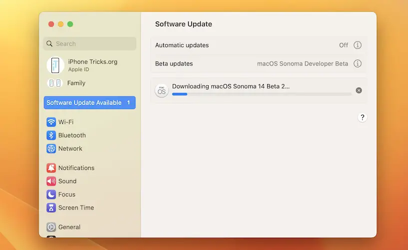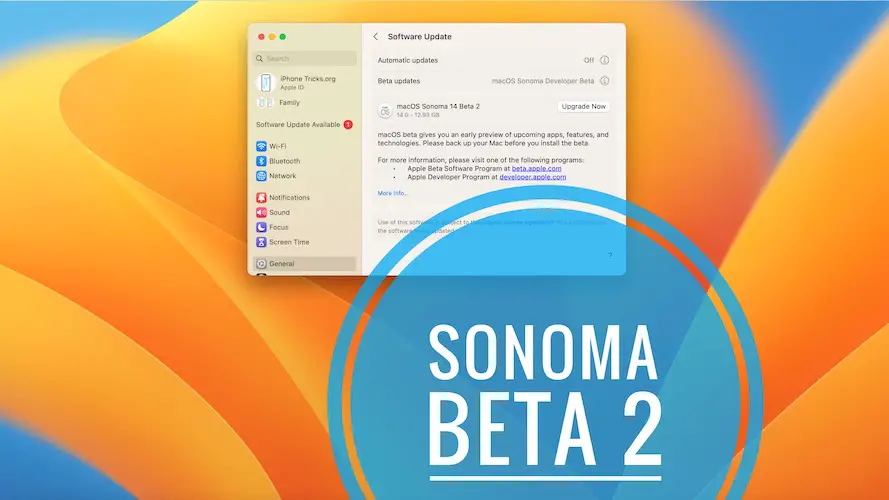 How To: Go for General -> Software Update -> Beta updates. Select macOS Sonoma Developer Beta option! Click Upgrade Now as soon as macOS Sonoma 14 Beta 2 shows up on the screen!