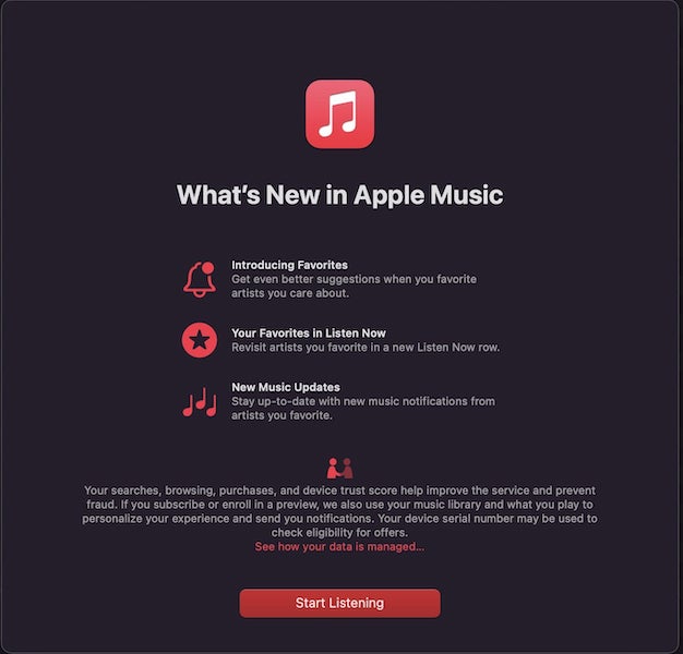 - Apple Music Splash Screen pops up the first time you open the app after the update informing you about What’s New in Apple Music. Introducing Favorites, Your Favorites In Listen Now and New Music Updates are highlighted.