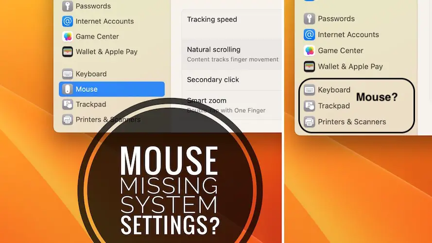 Mouse menu not available in System Settings in macOS Ventura? You’re trying to connect a mouse to Mac, but Mouse settings are not available in the left sidebar, under Keyboard and above Trackpad?