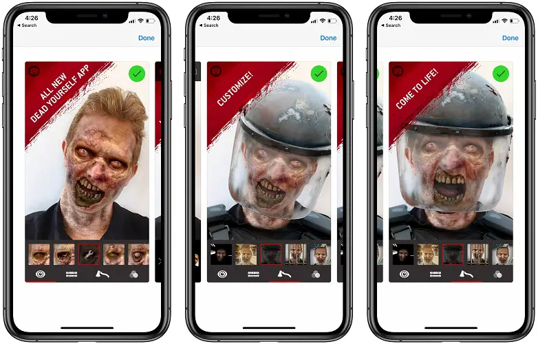 Snap a photo ore use one from the Photos app to transform yourself in an incredible realistic zombie from ‘The Walking Dead’ series. You can edit your eyes, mouth, add accessories and much more!
