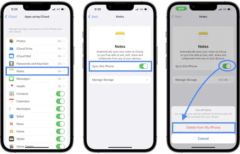 Tip: If syncing is enabled you can disable it. Confirm that you want to do it by taping on Delete from My iPhone. Next, enable back Sync this iPhone to force your device to download all notes from iCloud again.
