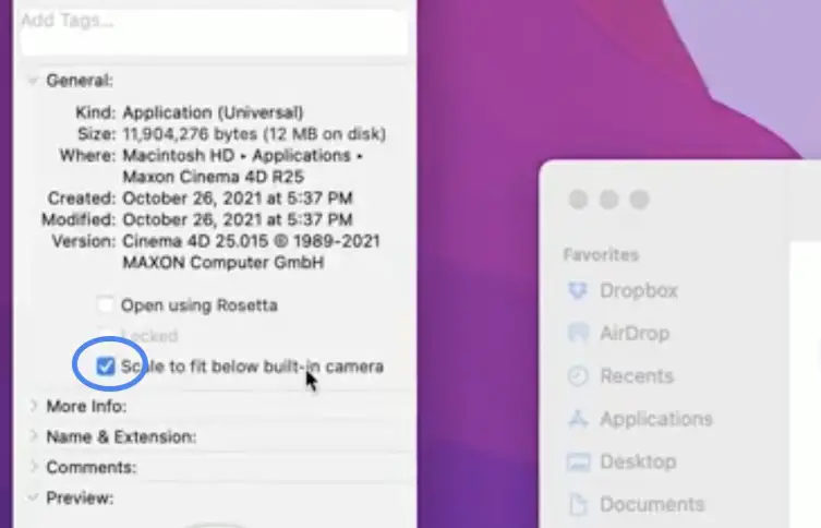 - Tick the checkbox next to ‘Scale to fit below built-in camera’ and the macOS Monterey display automatically adjusts when you open the specific app.
