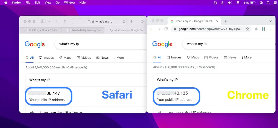 what's my IP - For comparisons sake, open Google Chrome or any other web browser on Mac (not Safari) and perform the same search. If the IP address matches the same from Safari, Private Relay isn’t working!