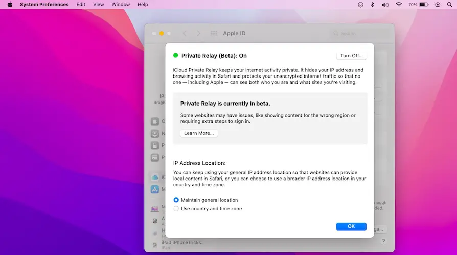 Nevertheless, if you’re not sure if your IP address is concealed while Private Relay is ‘Loading’ in System Preferences and not showing its activation status, you can perform an IP lookup in Safari: