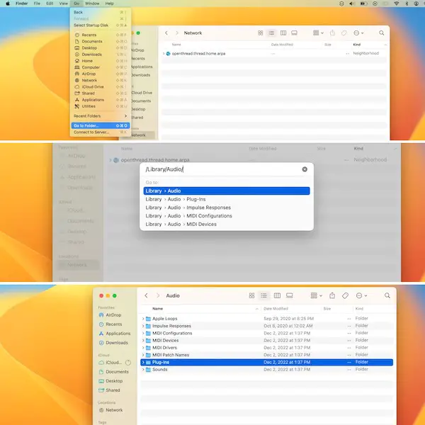 /Library/Audio/and hit Return. - 5. Click the Audio folder and go for Plug-Ins -> HAL.