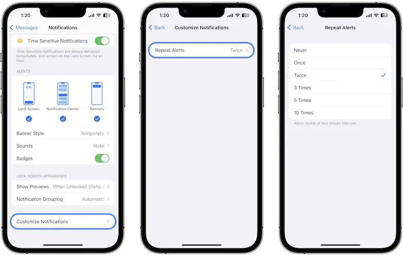 If Customize Notifications is available and you’ve turned On Repeat Alerts, but are getting a single notification, try to cycle this option: