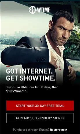 Step 2: Open the app and subscribe to Showtime, by grabbing the in-app purchase. Don’t worry you won’t be charged. The 30-day trial period comes first. If you don’t cancel your subscription by the end of the first month, you’ll be charged for $10.99 on the 31st day.