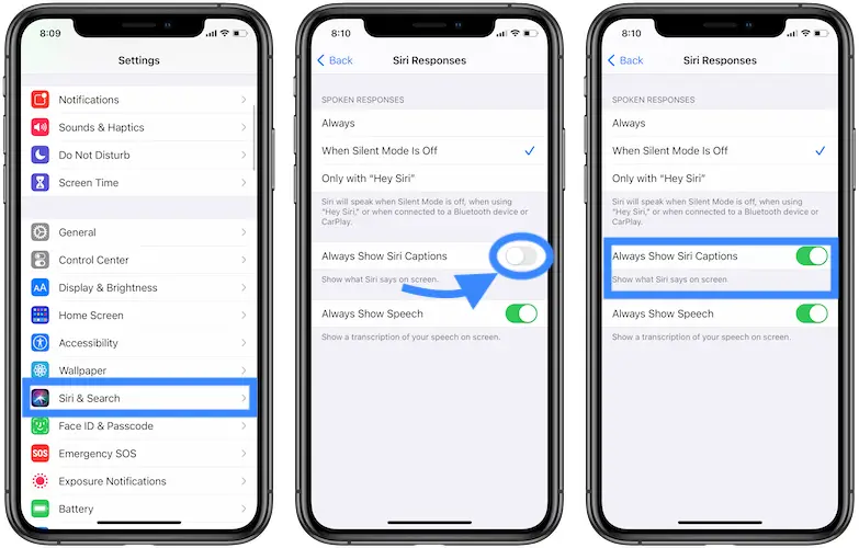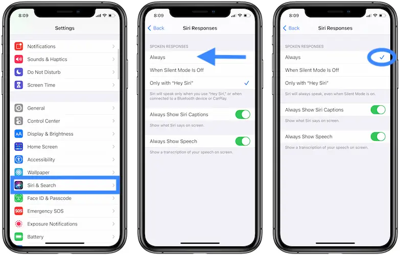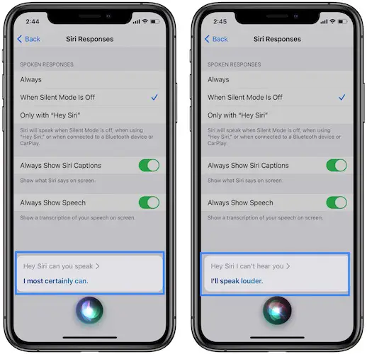Tip: You can set Siri to always speak out, even when the Silent switch is turned On. To achieve this, browse for Settings -> Siri & Search -> Siri Responses. Select Always from the Spoken Responses category.