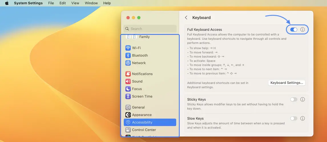 - Turn Off Full Keyboard Access.