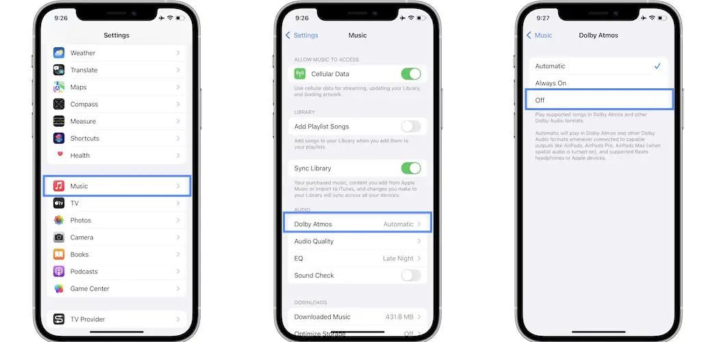 How to: Browse for Settings -> Music -> Dolby Atmos -> Off.
