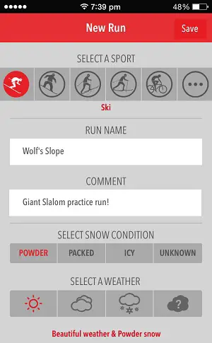 The Autostop function stops the tracking process when you finish or pause your run. Next, you can complete a short form with additional info about your descent. Select if you performed alpine skiing, snowboarding, ski touring, cross-country or anything else. Name your run, provide a suggestive comment and select the run’s slope conditions. Was the snow Powder, Icy, Packed or? Input what weather conditions you faced and also add a picture from your route. All this helps to better track your performance. More, if you share your stats, other skiers will be able to inform themselves about skiing conditions in your area.