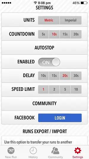 Access Ski Pursuit Settings from the same navigation menu and tweak the app for your taste. Select desired Measurement Units, adjust countdown length (after pressing GO), enable/disable Autostop function, edit Delay, the inferior Speed Limit (the limit when data recording stops, assuming that a run has been completed) and much more.