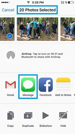 3. Tap the Share button, available in the bottom right corner of the screen. Notice, that the Message selection isn’t available, because your collection surpassed the selection limit.