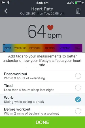 Once a reading is completed the app will automatically record it for you. You’ll be prompted with a heart rate scale and see where your rate currently fits. More, you are also asked to add a tag to your measurement, which helps to keep better track of readings. You can select from a predefined list, available in the nearby image, or add a new tag. Now tap ‘Done’ and you’ll be redirected to the Instant Heart Rate timeline. Here you can check past readings, see how your pulse averages for a certain tag, perform a Stand-Up test or check worldwide heart beat trends.