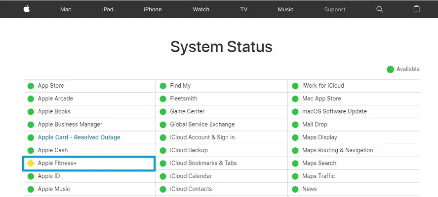 Tip: The ‘Unable To Access Apple Fitness+ Content At This Time’ error might be also caused by a temporary service downtime. You can check if there is an ongoing issue by opening the Apple’s System Status page.