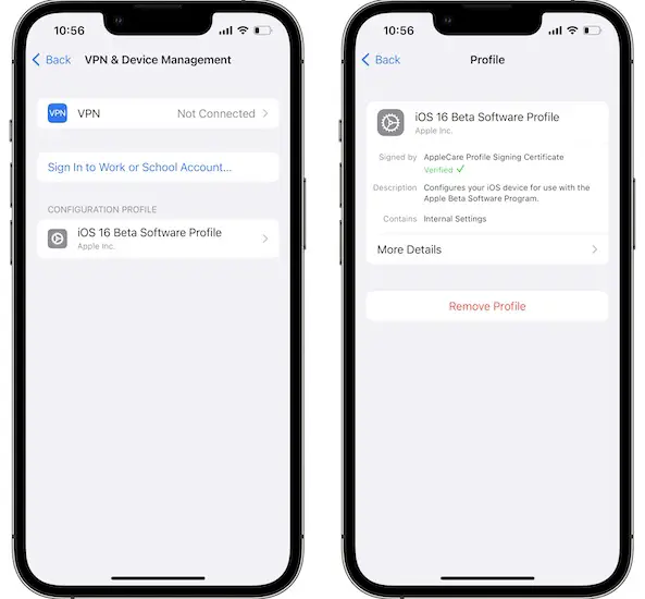 - 2. Open Settings and browse for General -> VPN & Device Management. If the iOS 16 Configuration Profile is installed, remove it and restart iPhone as prompted.