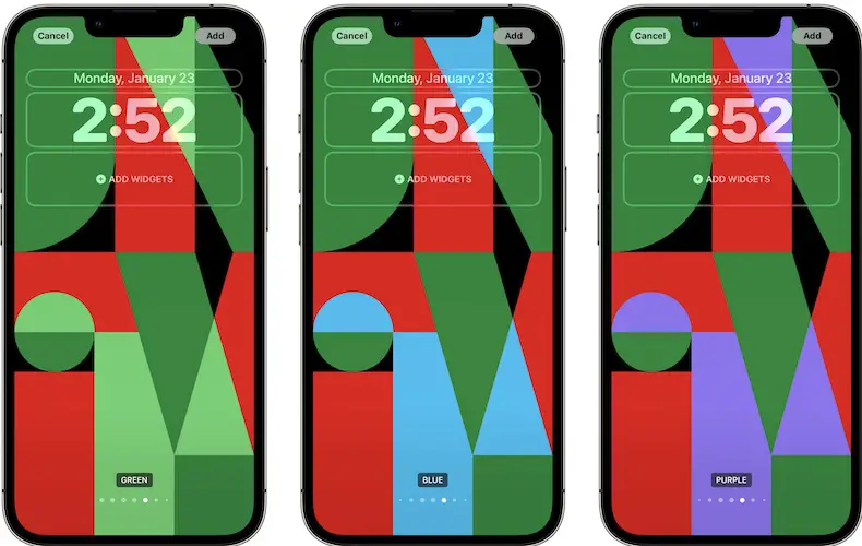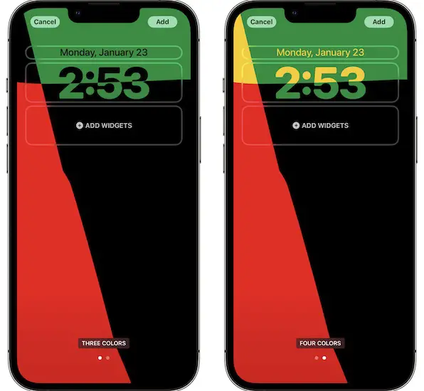 - The Three Colors Unity wallpaper comes with two options. You can swipe-left and bring up the Four Colors option, which adds the yellow color to upper half of the current time and the top widget panel!