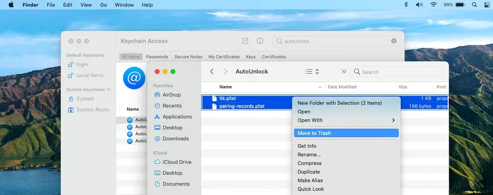 - 9. The AutoUnlock folder should contain the ‘ltk.plist’ and ‘pairing-records.plist’ files. Select them, right-click on the selection and choose Move to Trash to delete them.