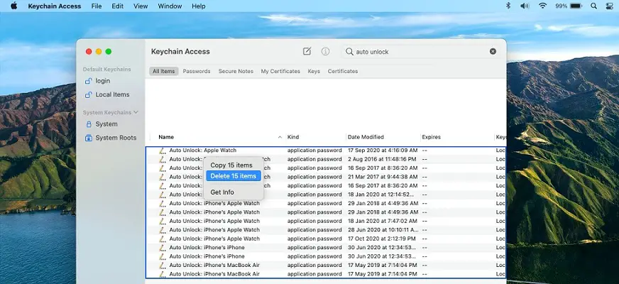 Fact: This will clear all conflicting auto unlock settings, but will also disable unlock for other Macs, if you own multiple macOS machines. - 6. Now, search in Keychain Access again, but this time for ‘AutoUnlock’, without a space.