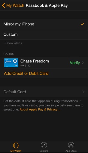 No matter if you already have Apple Pay set up on your iOS device, you still need to add your cards and configure the system on your Watch too. This is done from the Apple Watch app installed on your iPhone. You can add up to eight credit or debit cards. They show app in the Passbook app and also on your wrist gadget’s display, whenever you call for the Apple Pay feature.