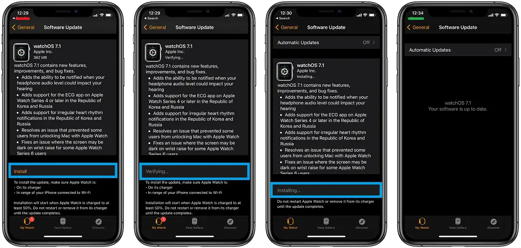An example shows a device started installing at 12:29 pm and the watchOS 7.1 update process was completed by 12:34 pm.