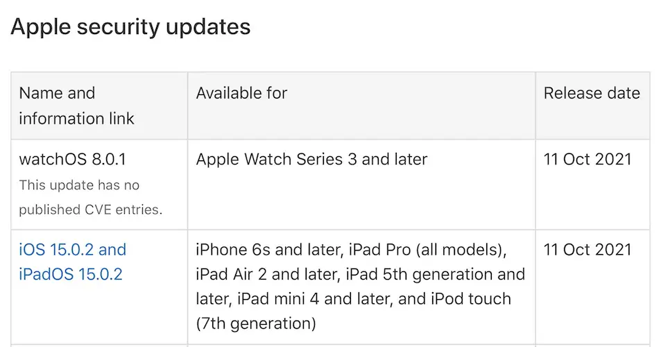 Fact: Apple also mentions that security content for this update is provided on its support website. However, as seen in the screenshot provided above, this update has ‘No published CVE entries’.