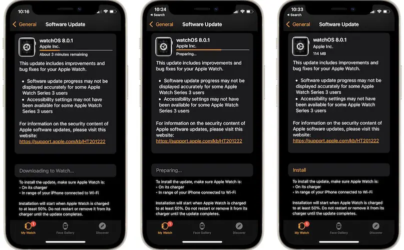 Fact: The watchOS 8.0.1 update file is 114 MB large. Size might differ depending on AW model and the watchOS version that you’re updating from.