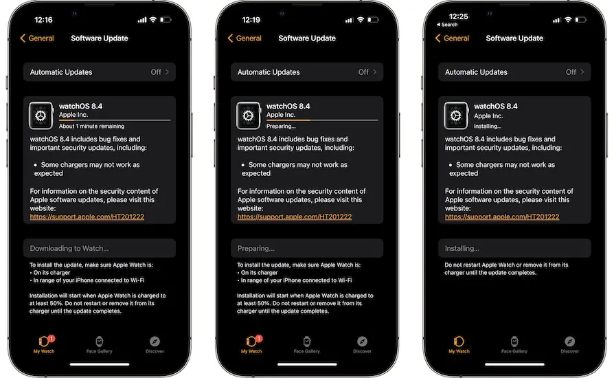 - Provide iPhone Passcode and be patient until watchOS 8.4 is downloaded, prepared for update and installed on your Apple Watch.
