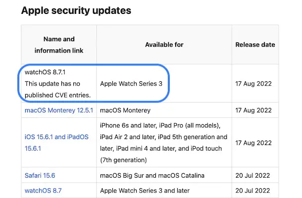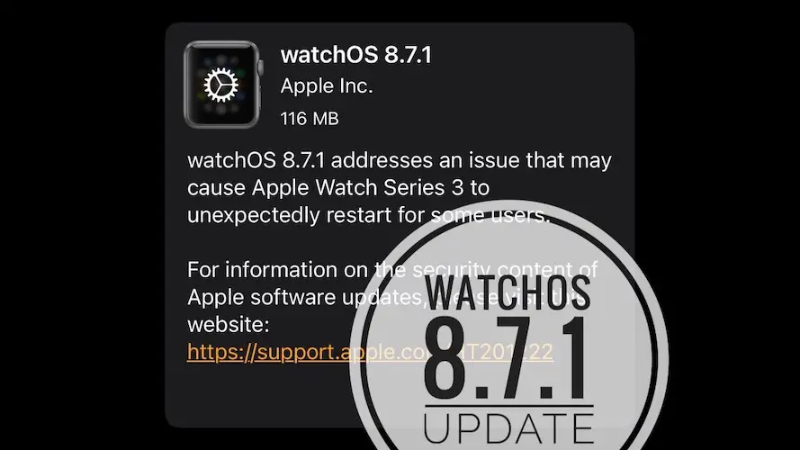 “watchOS 8.7.1 addresses an issue that may cause Apple Watch Series 3 to unexpectedly restart for some users.”