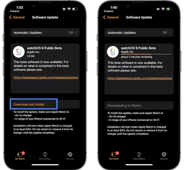 - 6. Tap Download and Install. Be patient until watchOS 9 Public Beta update is requested, downloaded and prepared for update.