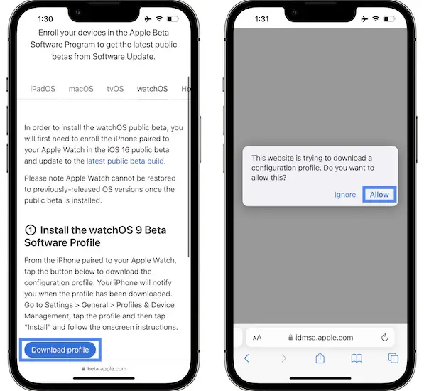 - 2. Tap Download profile, available in the watchOS 9 section.