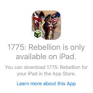 Description: Experience the American Revolution on your iPad and command the armies of the British Redcoats, English Loyalists, German Hessians, American Regulars, Patriots, French Regulars or Native Americans. Play a deciding role in the fate of the Americas. You can play against the AI, a friend available nearby or cross-platform online! There are 3 scenarios available: 1775, 1775 (Short) and Siege of Quebec. Good luck!