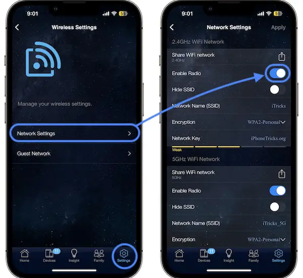 How to: Download your routers app and search for Settings (Wireless Settings -> Network Settings). Disable Radio, or turn Off network, whatever is available!