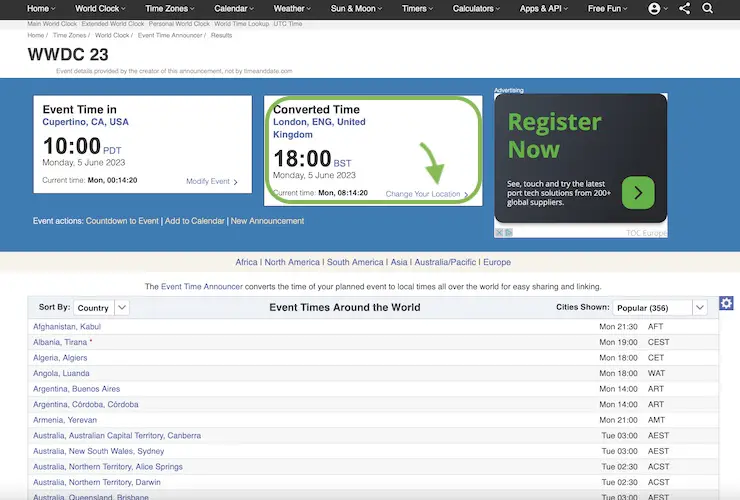 Fact: The website will detect your location based on your device’s IP address and the WWDC23 keynote time will be shown at the top of your page next to the original start time!