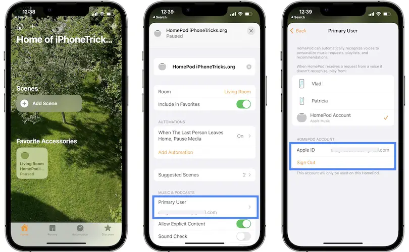 - Check the Apple ID available under HomePod Account. If it’s not the one you use, Sign Out and log-in with the correct one!