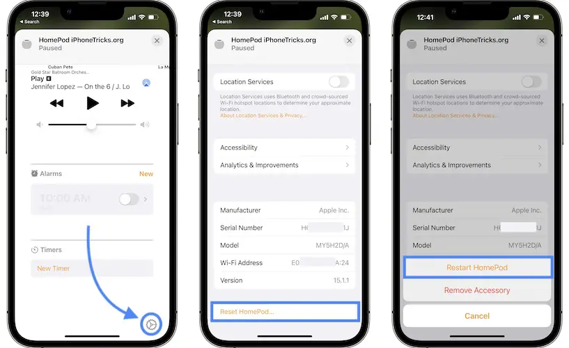 How to: In the same Settings menu mentioned above scroll until the bottom and use the Reset HomePod option. Go for Restart Homepod and be patient until the accessory reboots.