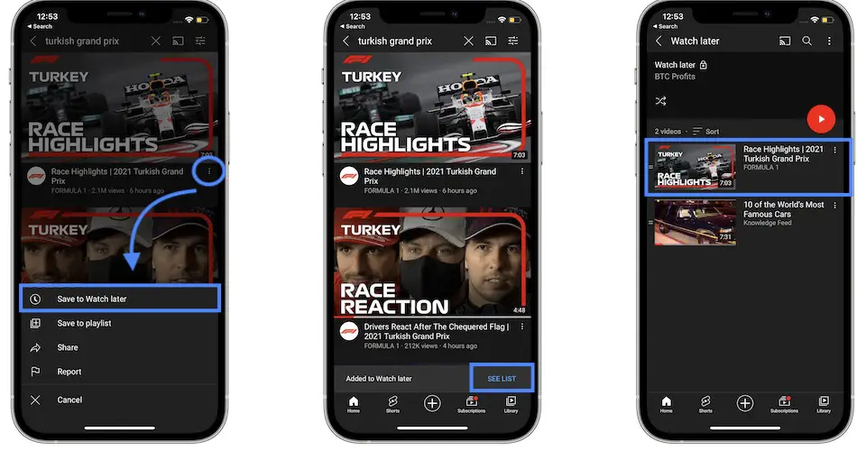 Last but not least, you can also tap the three-dots next to the YouTube video title and use the Save to Watch later option. The video will be saved to the list. Tap See List and you can play the clip from there.